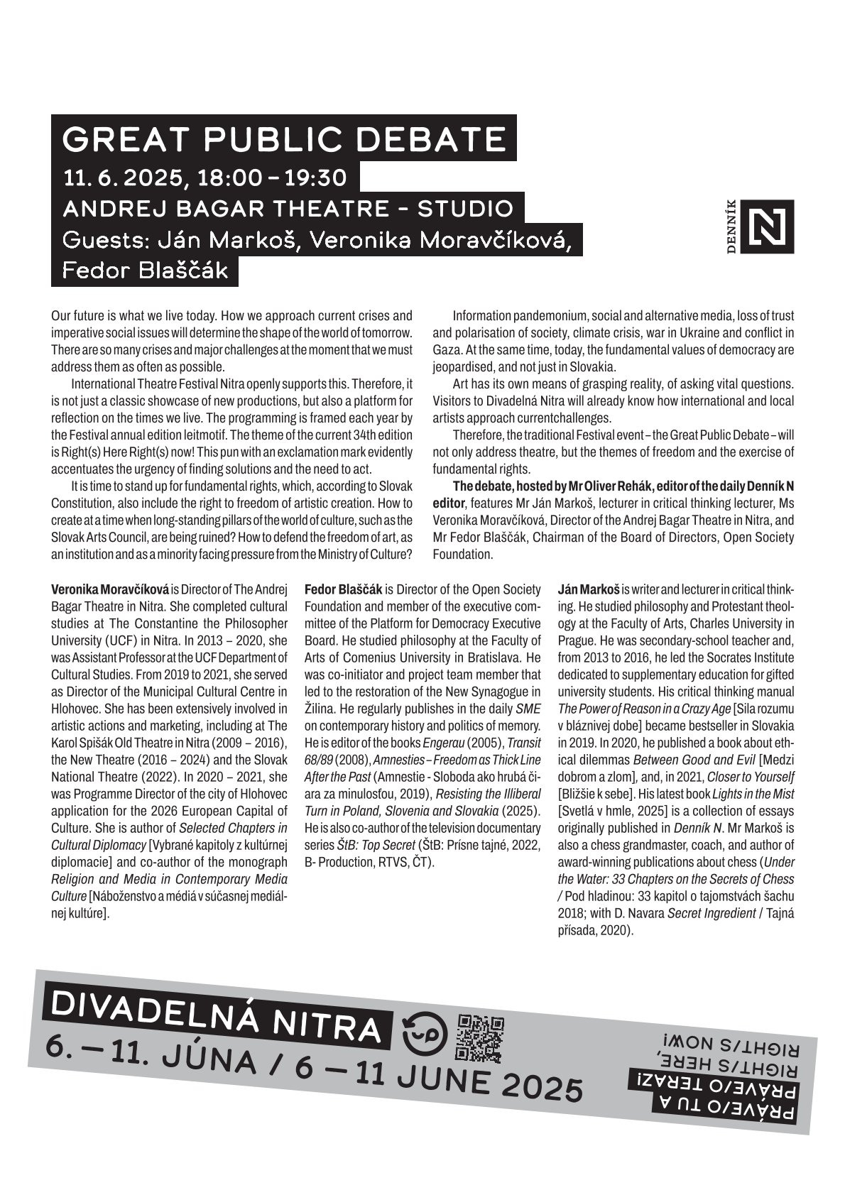 Guests: Ján Markoš, lecturer in critical thinking and columnist, Fedor Blaščák, director, Open Society Foundation, Veronika Moravčíková, director, The Andrej Bagar Theatre in Nitra